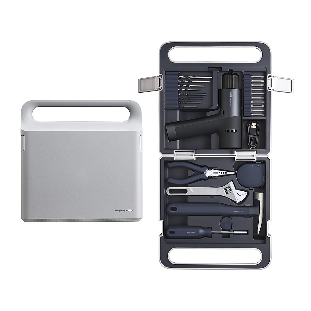 دارای یک آچار با یک دهانه 25 میلی متری، نوار اندازه گیری 3 متری، پیچ گوشتی دقیق با 28 بیت مختلف، چکش با طراحی مغناطیسی و کلاهک چرمی